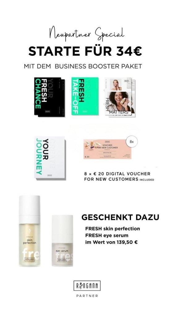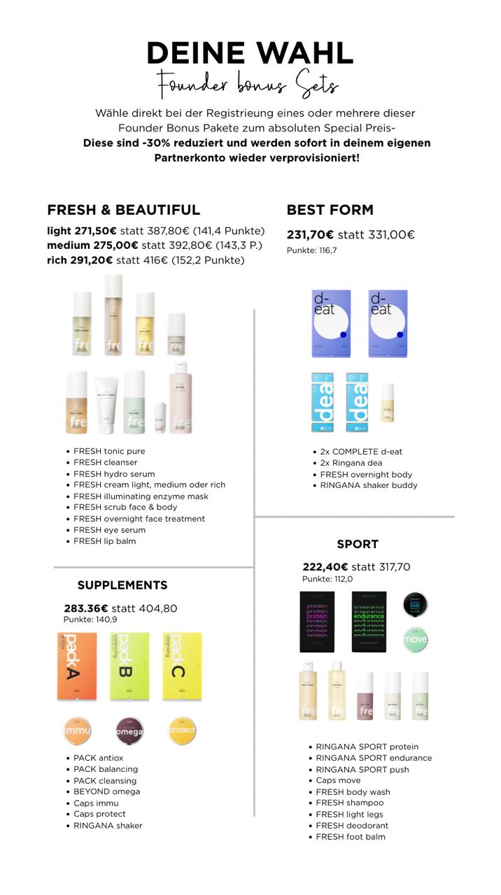 Von Ringana bekommst du Gutscheine und Samples für deine ersten Kund:innen und wenn du selber noch keine Ringana Produkte besitzt, kannst du diese mit einem 30% Rabatt als Founder-Bonus-Set direkt mit deinem Partner Antrag bestellen. Zum Start bekommst du von Ringana noch eine Tasche voll Produkte dazu geschenkt!